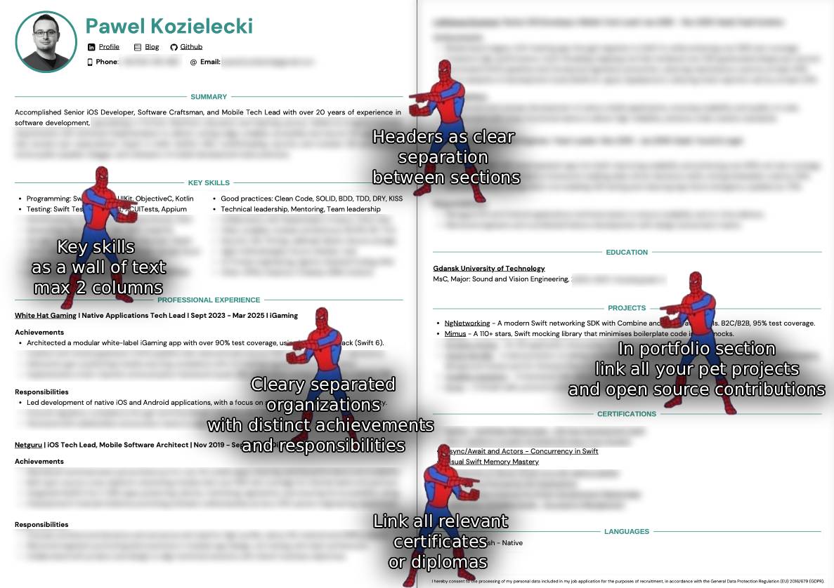 Whenever working with AI, context is paramount! You’re likely to get totally different responses if you provide an LLM with a proper setting for your questions. It’s the same with your skills. Although it might sound excessive, it’s really worth carving out some space to signify what area your skills belong to, e.g.Programming: Swift, SwiftUI, UIKit, ObjectiveC, Kotlin or Good practices: Clean Code, SOLID, BDD, TDD, DRY, KISS. - Emphasize skills mentioned in the job advertisement: